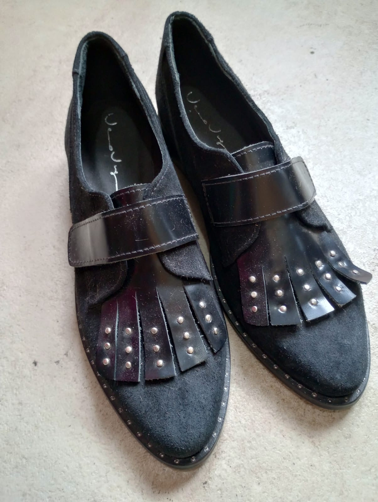 • Lengüeta con flecos y tachas doradas: el toque protagonista