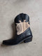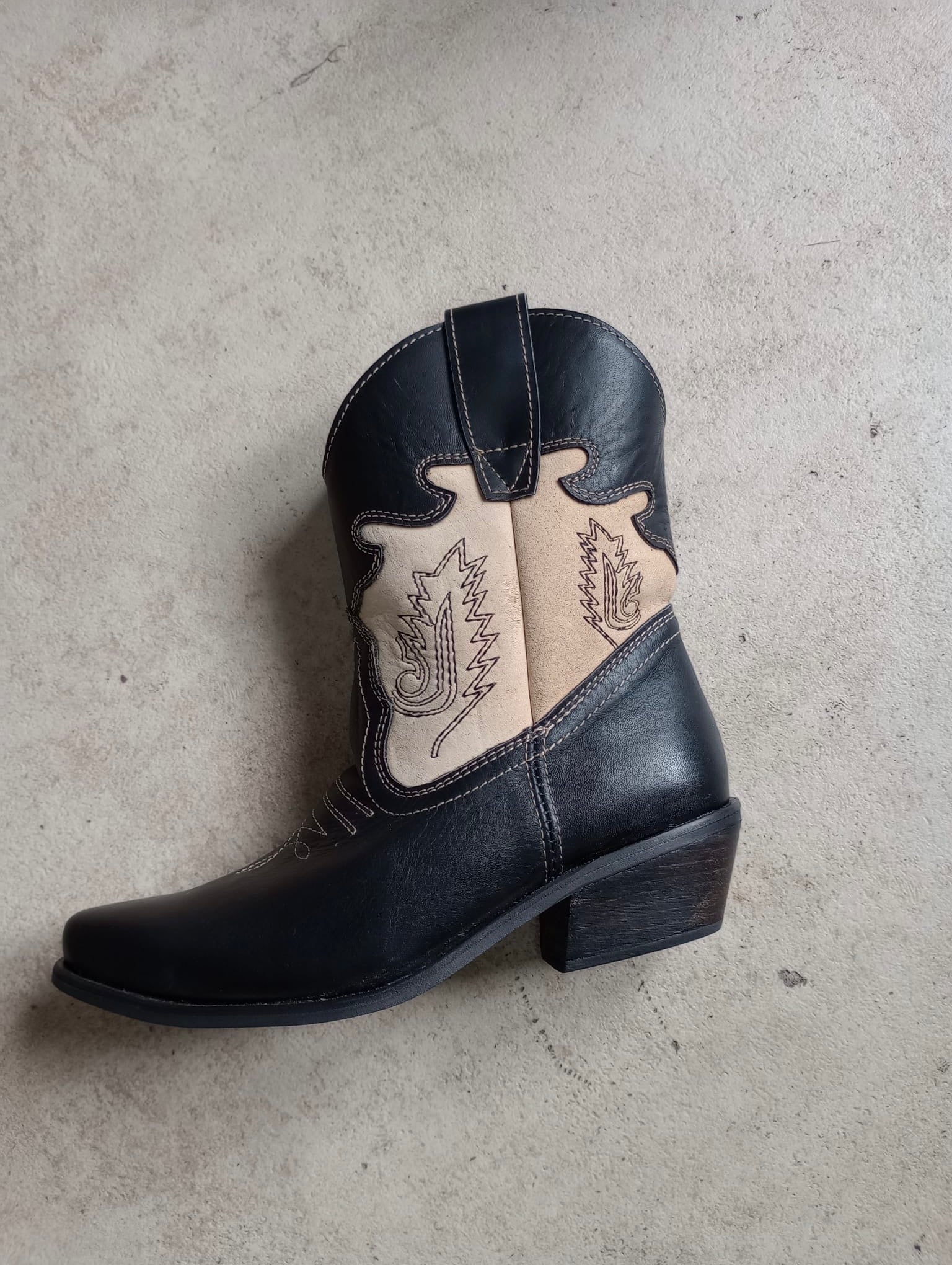 Combina cuero negro y gamuza clara en un diseño lleno de contraste, con bordados artesanales que la hacen única.