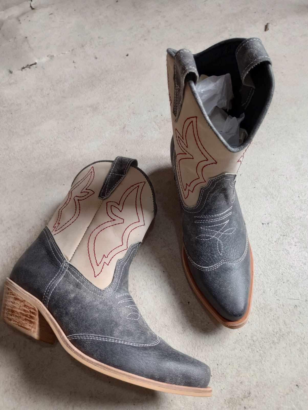 El cuero gris gastado, junto con la caña beige y los bordados en rojo, le dan un estilo único, moderno y con aire vintage.